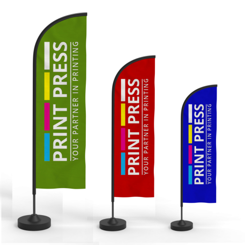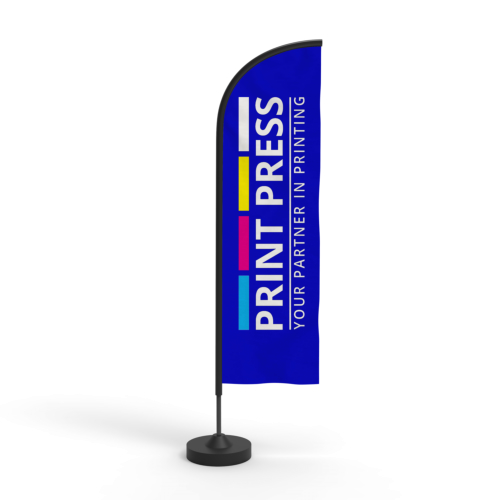 Unpack at your event in the open air and have the necessary beach flags printed in full color. Choose from 6 sizes, with heights from 165 to no less than 350 centimeters. We then print your own beach flag on flexible yet sturdy flag fabric. Beach flags can also be ordered separately, without a system.