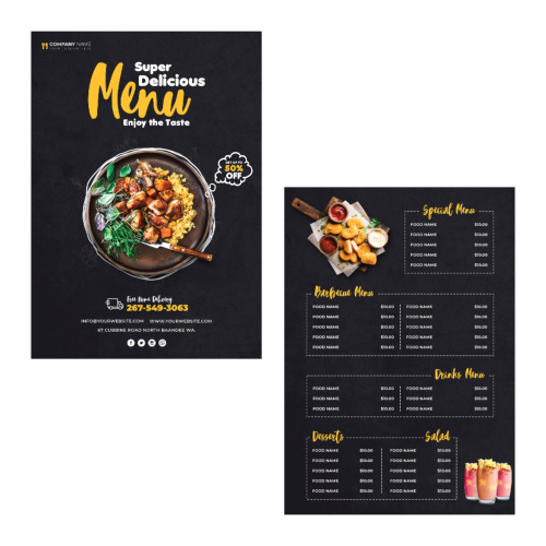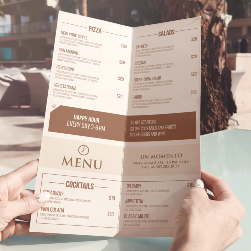 A beautiful menu with your own design makes the difference. We print menus in full color, on both sides.