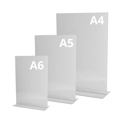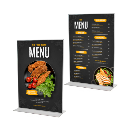 Double-sided display on desks, tables, and counters in restaurants, bars, retail stores, trade show booths, hotels and other business locations.